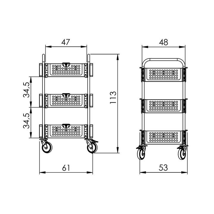 • š61 cm x h53 cm x v113 cm - rozměry základního vozíku, celkové rozměry závisí na zvolné konfiguraci přídavných boxů