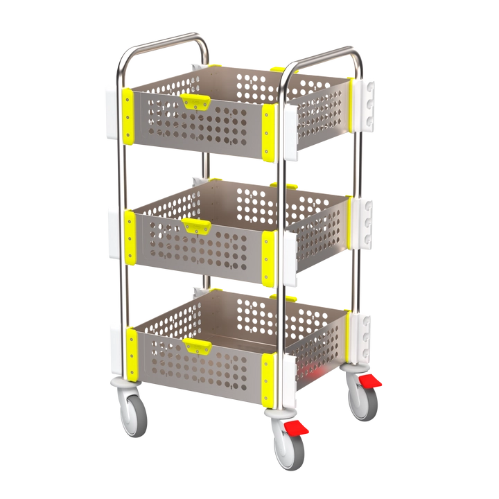 • konstrukce vozíku a boxů: nerezová ocel AISI304, plastové ochranné prvky v barevném provedení