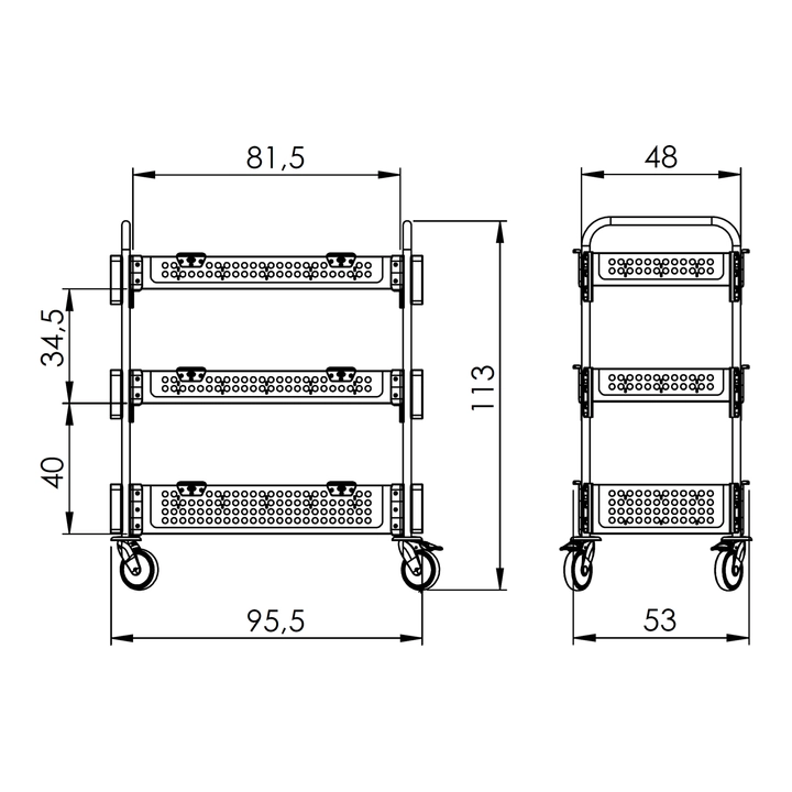 • š95,5 cm x h53 cm x v113 cm - rozměry základního vozíku, celkové rozměry závisí na zvolné konfiguraci přídavných boxů
