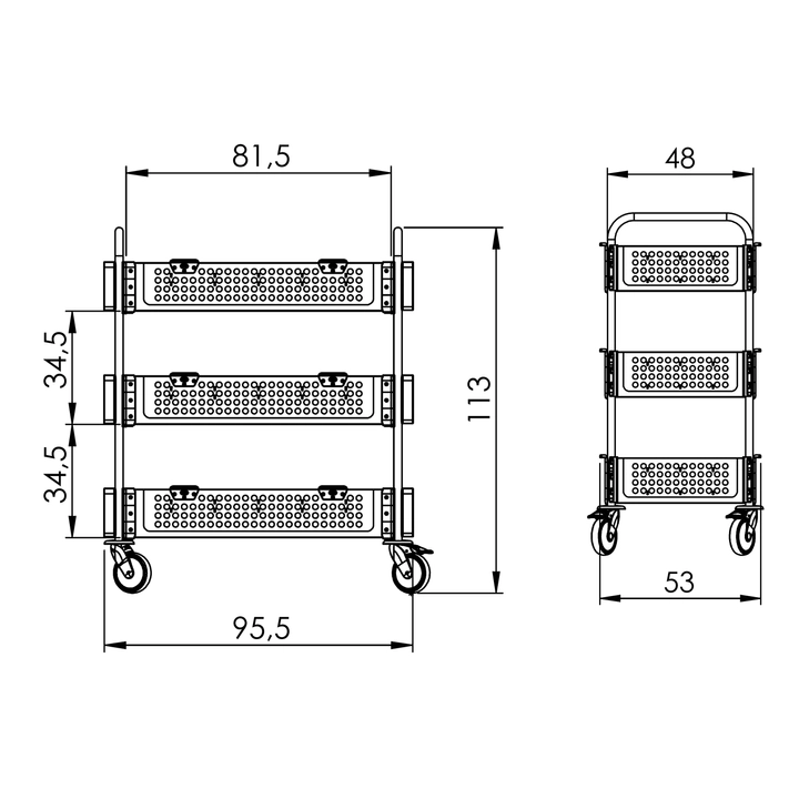 • š95,5 cm x h53 cm x v113 cm - rozměry základního vozíku, celkové rozměry závisí na zvolné konfiguraci přídavných boxů