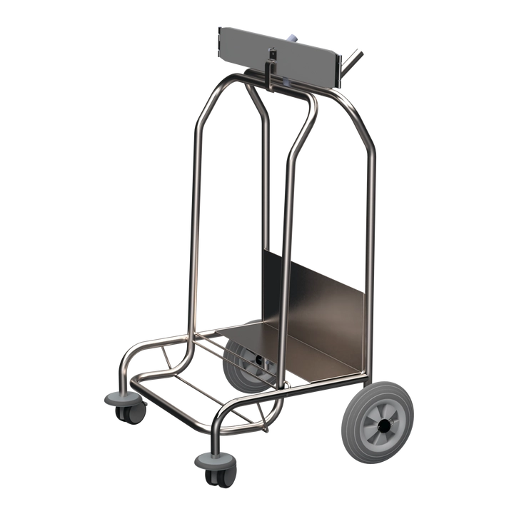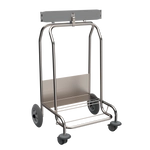 • š64 cm x h55 cm x v97 cm - rozměry stojanu; objem 80l • konstrukce: nerez ocel AISI304 • planžeta: gumová, odolná - hermeticky uzavřená • 2x pevné d=20 cm, 2x otočné kolo d=6,5 cm, 2x brzda; plast. nárazníky • celková nosnost: 40 kg