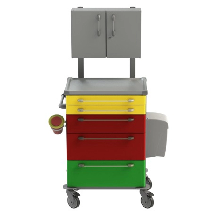 • vozík je ukázkově vybaven: 5773* - skříňka z nerezové oceli, 5757* - držák kontejneru na použité jehly, 5754B* - plastový odpadní koš s bezdotykovým ovládáním